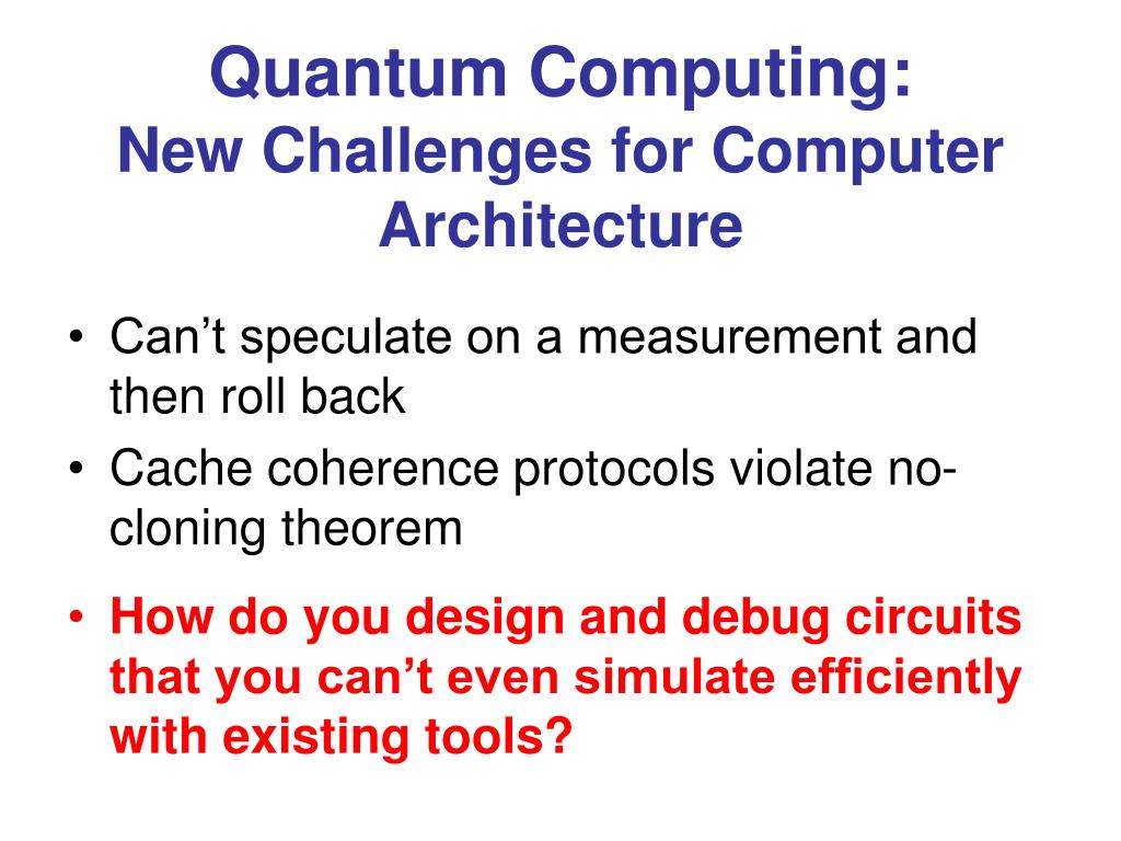 Quantum Computing:New Challenges for Computer Architecture • Can’t speculate on a measurement and then roll back • Cache coherence protocols violate no-cloning theorem • How do you design and debug circuits that you can’t even simulate efficiently with existing tools?