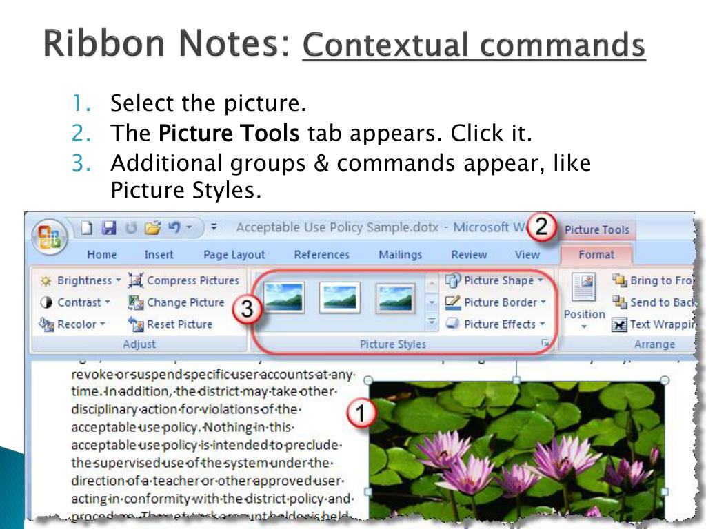 Ribbon Notes: Contextual commands • Select the picture. • The Picture Tools tab appears. Click it. • Additional groups & commands appear, like Picture Styles.