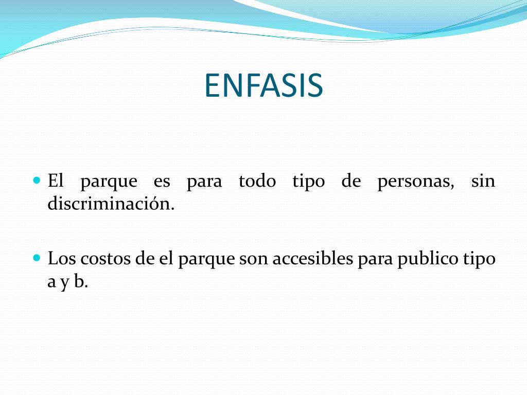 ENFASIS • El parque es para todo tipo de personas, sin discriminación. • Los costos de el parque son accesibles para publico tipo a y b.