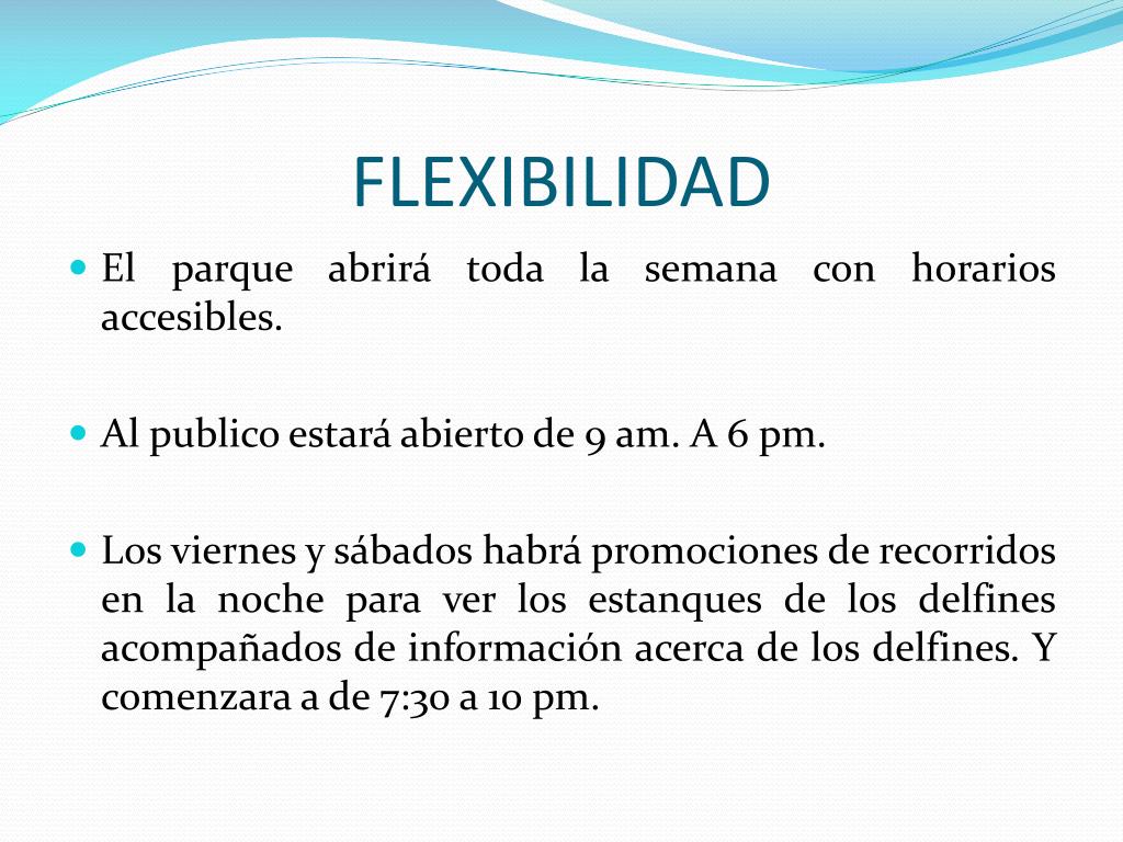 FLEXIBILIDAD • El parque abrirá toda la semana con horarios accesibles. • Al publico estará abierto de 9 am. A 6 pm. • Los viernes y sábados habrá promociones de recorridos en la noche para ver los estanques de los delfines acompañados de información acerca de los delfines. Y comenzara a de 7:30 a 10 pm.