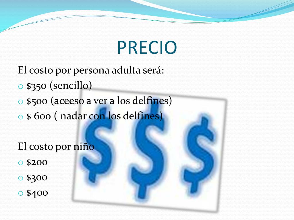 PRECIO El costo por persona adulta será: • $350 (sencillo) • $500 (aceeso a ver a los delfines) • $ 600 ( nadar con los delfines) El costo por niño • $200 • $300 • $400