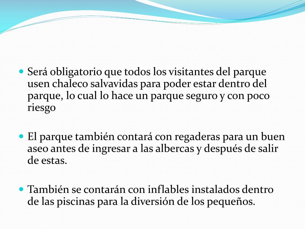 Será obligatorio que todos los visitantes del parque usen chaleco salvavidas para poder estar dentro del parque, lo cual lo hace un parque seguro y con poco riesgo • El parque también contará con regaderas para un buen aseo antes de ingresar a las albercas y después de salir de estas. • También se contarán con inflables instalados dentro de las piscinas para la diversión de los pequeños.