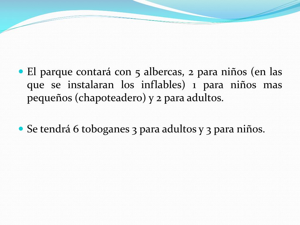 El parque contará con 5 albercas, 2 para niños (en las que se instalaran los inflables) 1 para niños mas pequeños (chapoteadero) y 2 para adultos. • Se tendrá 6 toboganes 3 para adultos y 3 para niños.
