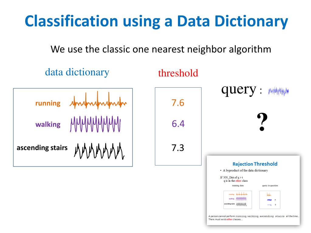 Classification using a Data Dictionary We use the classic one nearest neighbor algorithm data dictionary threshold 7.6 running 6.4 walking ascending stairs 7.3