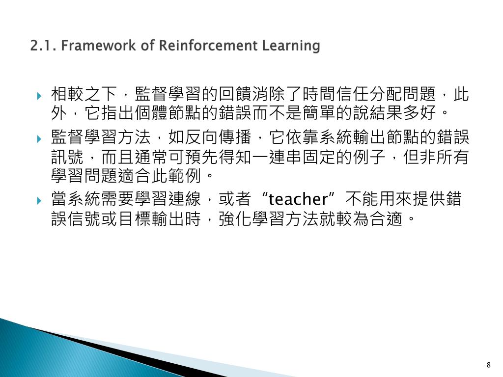 2.1. Framework of Reinforcement Learning • 相較之下,監督學習的回饋消除了時間信任分配問題,此外,它指出個體節點的錯誤而不是簡單的說結果多好。 • 監督學習方法,如反向傳播,它依靠系統輸出節點的錯誤訊號,而且通常可預先得知一連串固定的例子,但非所有學習問題適合此範例。 • 當系統需要學習連線,或者“teacher”不能用來提供錯誤信號或目標輸出時,強化學習方法就較為合適。