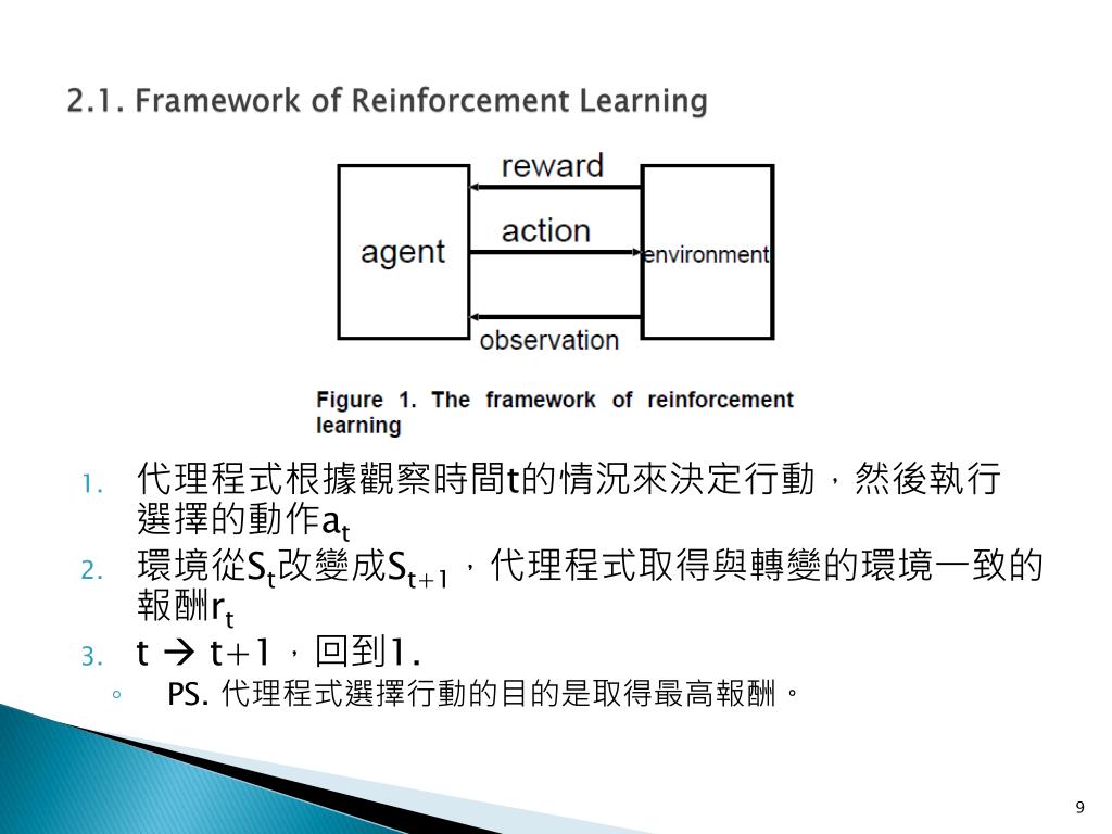2. Reinforcement Learning2.1. Framework of Reinforcement Learning • 強化學習是透過經驗來改善代理程式在環境中行為的過程。 • 環境回饋是一簡單的數量值。 • 在強化訊號進行了一連串行動後,它反映出整個系統的成敗 • 因此,強化訊號不分配信任或責任給任何一動作,或任何特定節點或系統要件