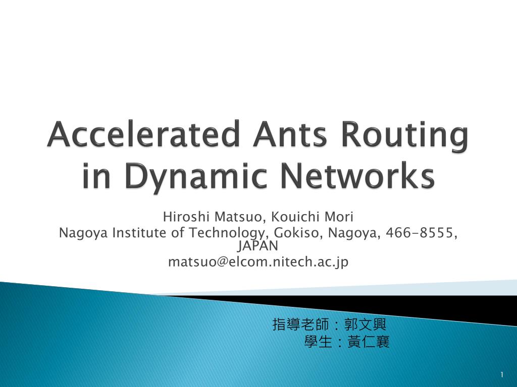 Accelerated Ants Routing in Dynamic Networks. Hiroshi Matsuo, Kouichi Mori Nagoya Institute of Technology, Gokiso , Nagoya, 466-8555, JAPAN matsuo@elcom.nitech.ac.jp. 指導 老師:郭文興 學生 :黃仁襄. Abstract. 根據個人資料助理 (PDA) 和無線網路設備的發展,在 ad hoc 網路上效率高的路由動態網路是一個重要的問題。