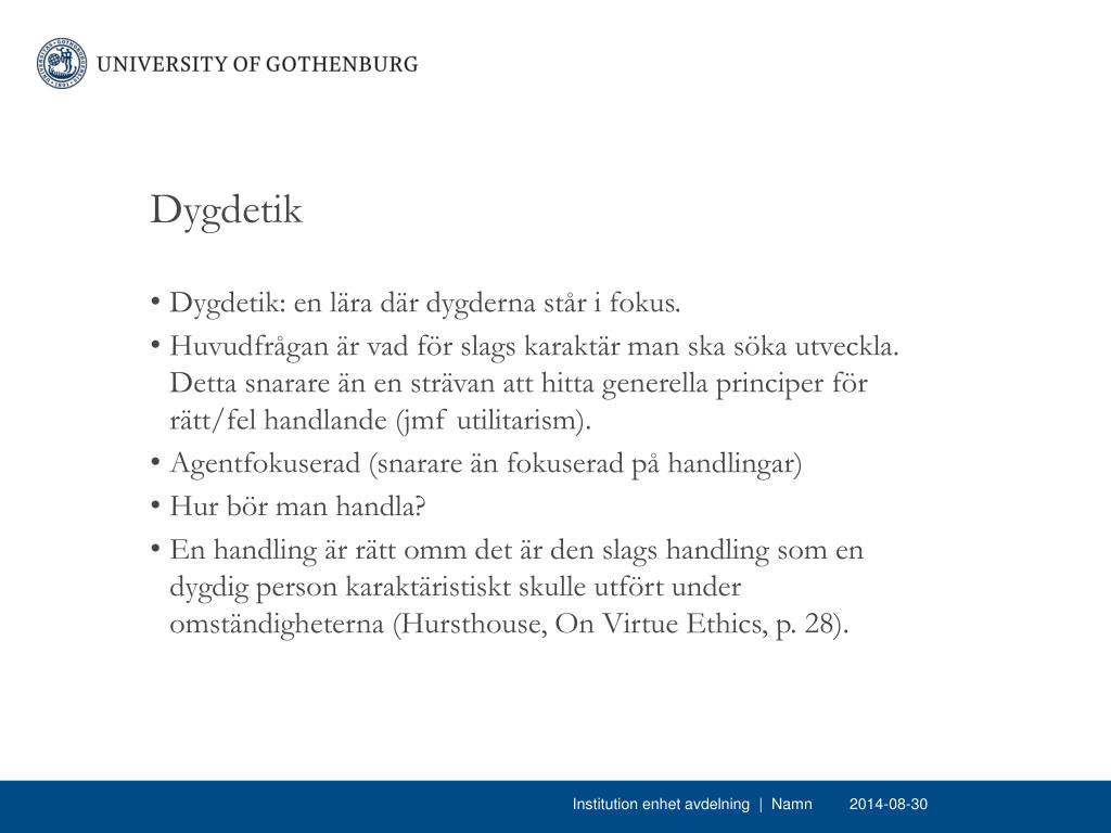 Dygdetik • Dygdetik: en lära där dygderna står i fokus. • Huvudfrågan är vad för slags karaktär man ska söka utveckla. Detta snarare än en strävan att hitta generella principer för rätt/fel handlande (jmf utilitarism). • Agentfokuserad (snarare än fokuserad på handlingar) • Hur bör man handla? • En handling är rätt omm det är den slags handling som en dygdig person karaktäristiskt skulle utfört under omständigheterna (Hursthouse, On Virtue Ethics, p. 28). Institution enhet avdelning | Namn