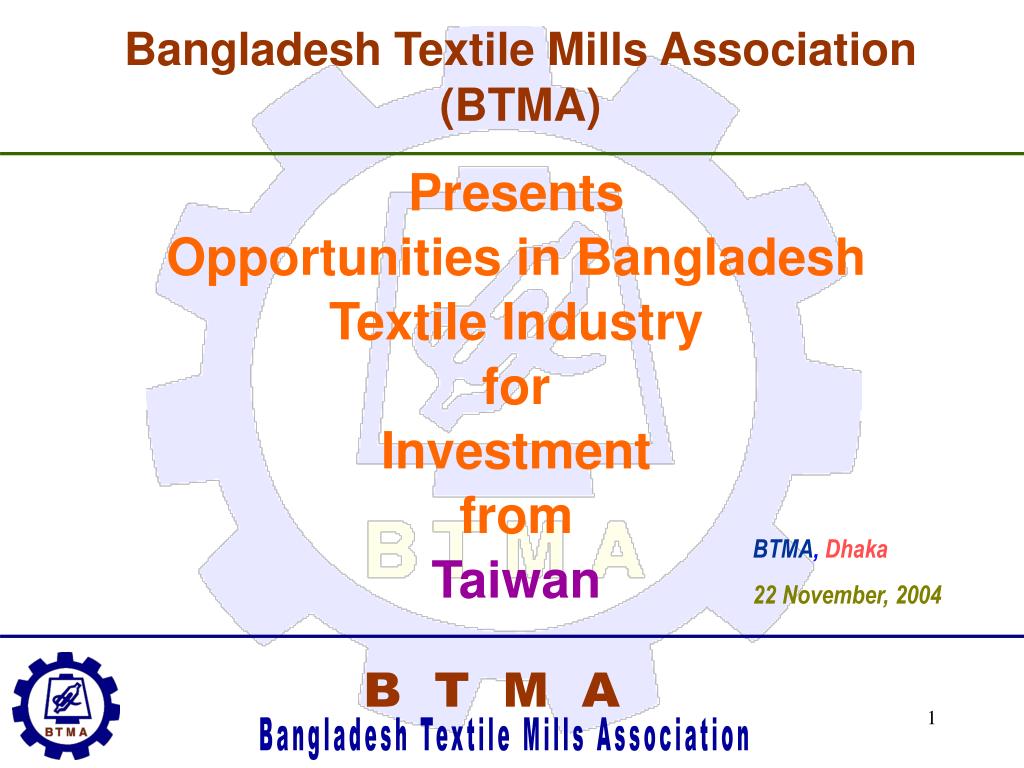 Bangladesh Textile Mills Association(BTMA) Presents Opportunities in Bangladesh Textile Industry for Investment from Taiwan BTMA, Dhaka 22 November, 2004 B T M A Bangladesh Textile Mills Association