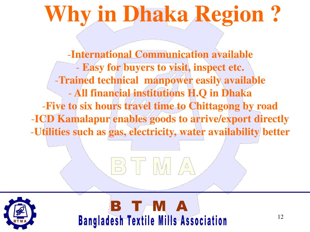 Why in Dhaka Region ? • International Communication available • Easy for buyers to visit, inspect etc. • Trained technical manpower easily available • All financial institutions H.Q in Dhaka • Five to six hours travel time to Chittagong by road • ICD Kamalapur enables goods to arrive/export directly • Utilities such as gas, electricity, water availability better B T M A Bangladesh Textile Mills Association