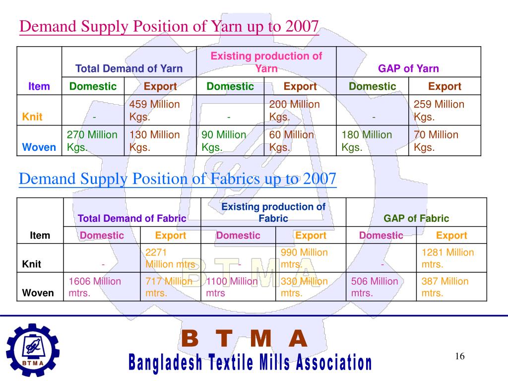 Demand Supply Position of Yarn up to 2007 Demand Supply Position of Fabrics up to 2007 B T M A Bangladesh Textile Mills Association