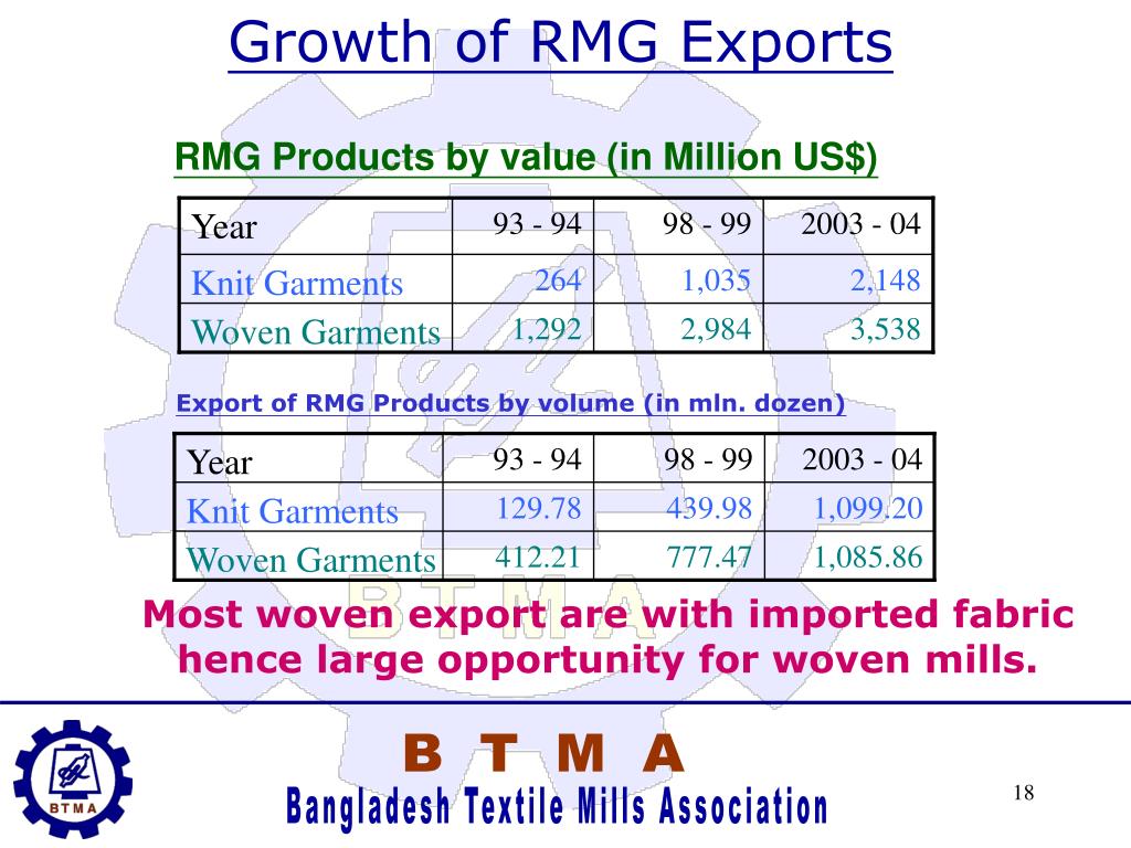 Growth of RMG Exports B T M A Bangladesh Textile Mills Association