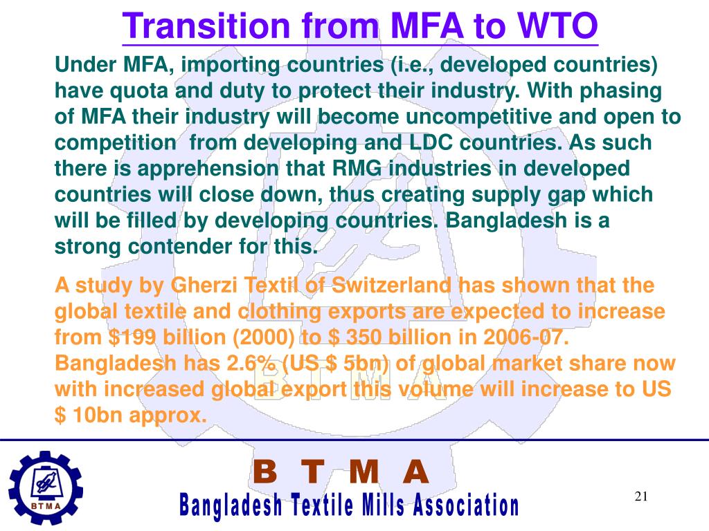 Transition from MFA to WTO • Under MFA, importing countries (i.e., developed countries) have quota and duty to protect their industry. With phasing of MFA their industry will become uncompetitive and open to competition from developing and LDC countries. As such there is apprehension that RMG industries in developed countries will close down, thus creating supply gap which will be filled by developing countries. Bangladesh is a strong contender for this. • A study by Gherzi Textil of Switzerland has shown that the global textile and clothing exports are expected to increase from $199 billion (2000) to $ 350 billion in 2006-07. Bangladesh has 2.6% (US $ 5bn) of global market share now with increased global export this volume will increase to US $ 10bn approx. B T M A Bangladesh Textile Mills Association