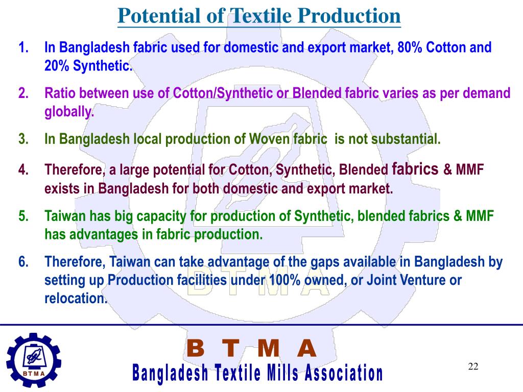 Potential of Textile Production • In Bangladesh fabric used for domestic and export market, 80% Cotton and 20% Synthetic. • Ratio between use of Cotton/Synthetic or Blended fabric varies as per demand globally. • In Bangladesh local production of Woven fabric is not substantial. • Therefore, a large potential for Cotton, Synthetic, Blended fabrics& MMF exists in Bangladesh for both domestic and export market. • Taiwan has big capacity for production of Synthetic, blended fabrics & MMF has advantages in fabric production. • Therefore, Taiwan can take advantage of the gaps available in Bangladesh by setting up Production facilities under 100% owned, or Joint Venture or relocation. B T M A Bangladesh Textile Mills Association