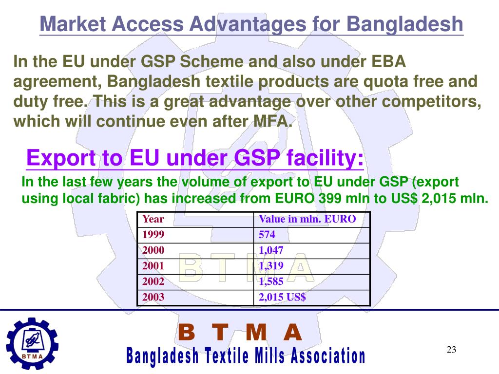 Market Access Advantages for Bangladesh In the EU under GSP Scheme and also under EBA agreement, Bangladesh textile products are quota free and duty free. This is a great advantage over other competitors, which will continue even after MFA. Export to EU under GSP facility: In the last few years the volume of export to EU under GSP (export using local fabric) has increased from EURO 399 mln to US$ 2,015 mln. B T M A Bangladesh Textile Mills Association