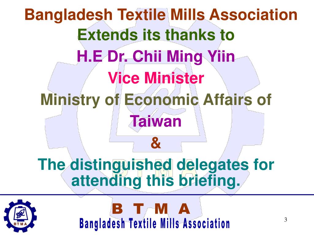 Bangladesh Textile Mills Association Extends its thanks to H.E Dr. Chii Ming Yiin Vice Minister Ministry of Economic Affairs of Taiwan & The distinguished delegates for attending this briefing. B T M A Bangladesh Textile Mills Association