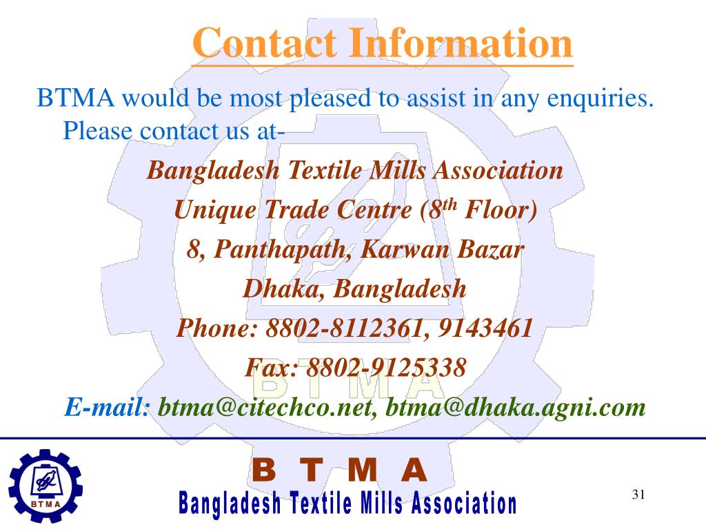 Contact Information BTMA would be most pleased to assist in any enquiries. Please contact us at- Bangladesh Textile Mills Association Unique Trade Centre (8th Floor) 8, Panthapath, Karwan Bazar Dhaka, Bangladesh Phone: 8802-8112361, 9143461 Fax: 8802-9125338 E-mail: btma@citechco.net, btma@dhaka.agni.com B T M A Bangladesh Textile Mills Association