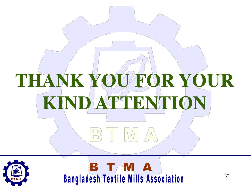 THANK YOU FOR YOUR KIND ATTENTION B T M A Bangladesh Textile Mills Association