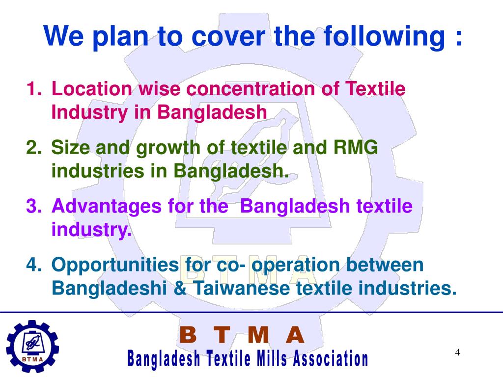 We plan to cover the following : • Location wise concentration of Textile Industry in Bangladesh • Size and growth of textile and RMG industries in Bangladesh. • Advantages for the Bangladesh textile industry. • Opportunities for co- operation between Bangladeshi & Taiwanese textile industries. B T M A Bangladesh Textile Mills Association