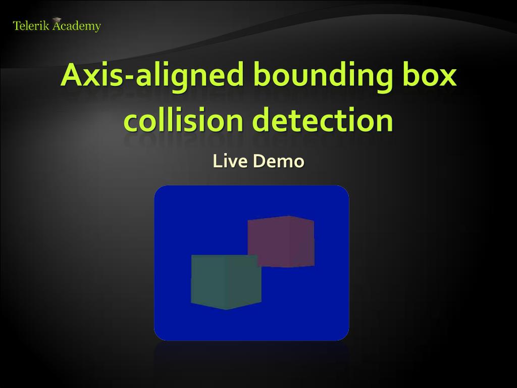Collision detection • Checking AABBs for collision • Treat the minimum and maximum corners’ coordinates as interval edges • 3D case • If the x intervals overlap • And the y intervals overlap • And the z intervals overlap • Then the AABBs intersect / collide