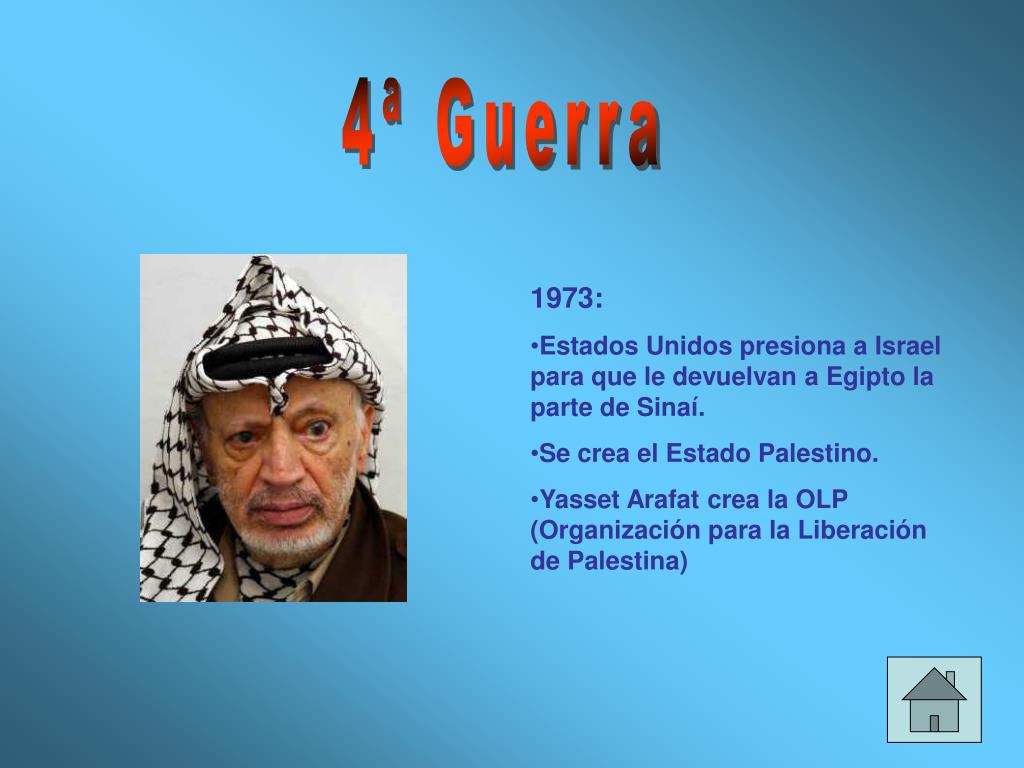 4ª Guerra • 1973: • Estados Unidos presiona a Israel para que le devuelvan a Egipto la parte de Sinaí. • Se crea el Estado Palestino. • Yasset Arafat crea la OLP (Organización para la Liberación de Palestina)