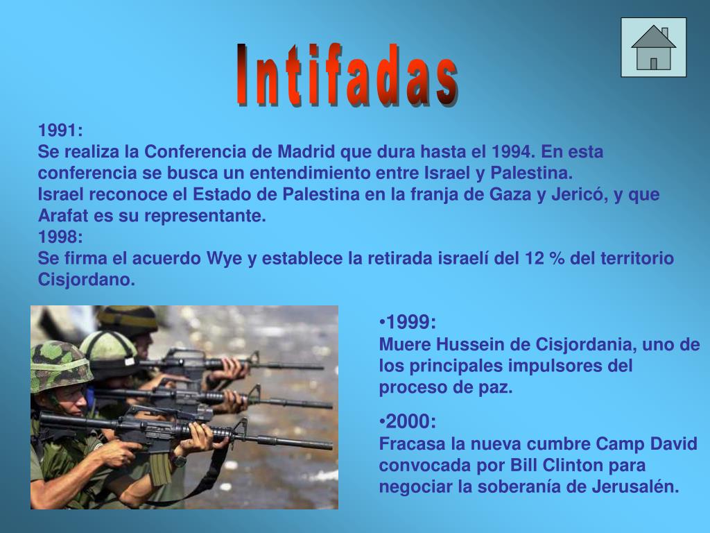 Intifadas 1991:Se realiza la Conferencia de Madrid que dura hasta el 1994. En esta conferencia se busca un entendimiento entre Israel y Palestina.Israel reconoce el Estado de Palestina en la franja de Gaza y Jericó, y que Arafat es su representante. 1998:Se firma el acuerdo Wye y establece la retirada israelí del 12 % del territorio Cisjordano. • 1999:Muere Hussein de Cisjordania, uno de los principales impulsores del proceso de paz. • 2000:Fracasa la nueva cumbre Camp David convocada por Bill Clinton para negociar la soberanía de Jerusalén.