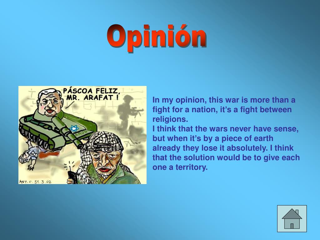 Opinión In my opinion, this war is more than a fight for a nation, it’s a fight between religions. I think that the wars never have sense, but when it’s by a piece of earth already they lose it absolutely. I think that the solution would be to give each one a territory.