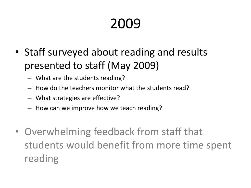 2009 • Staff surveyed about reading and results presented to staff (May 2009) • What are the students reading? • How do the teachers monitor what the students read? • What strategies are effective? • How can we improve how we teach reading? • Overwhelming feedback from staff that students would benefit from more time spent reading