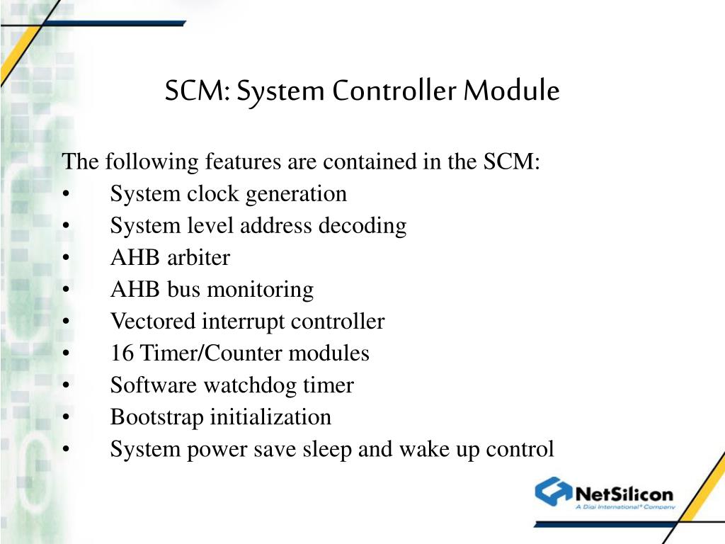 NS9750 - Training Hardware. System Controller Module. SCM: System Controller Module. The following features are contained in the SCM: System clock generation System level address decoding AHB arbiter AHB bus monitoring Vectored interrupt controller 16 Timer/Counter modules