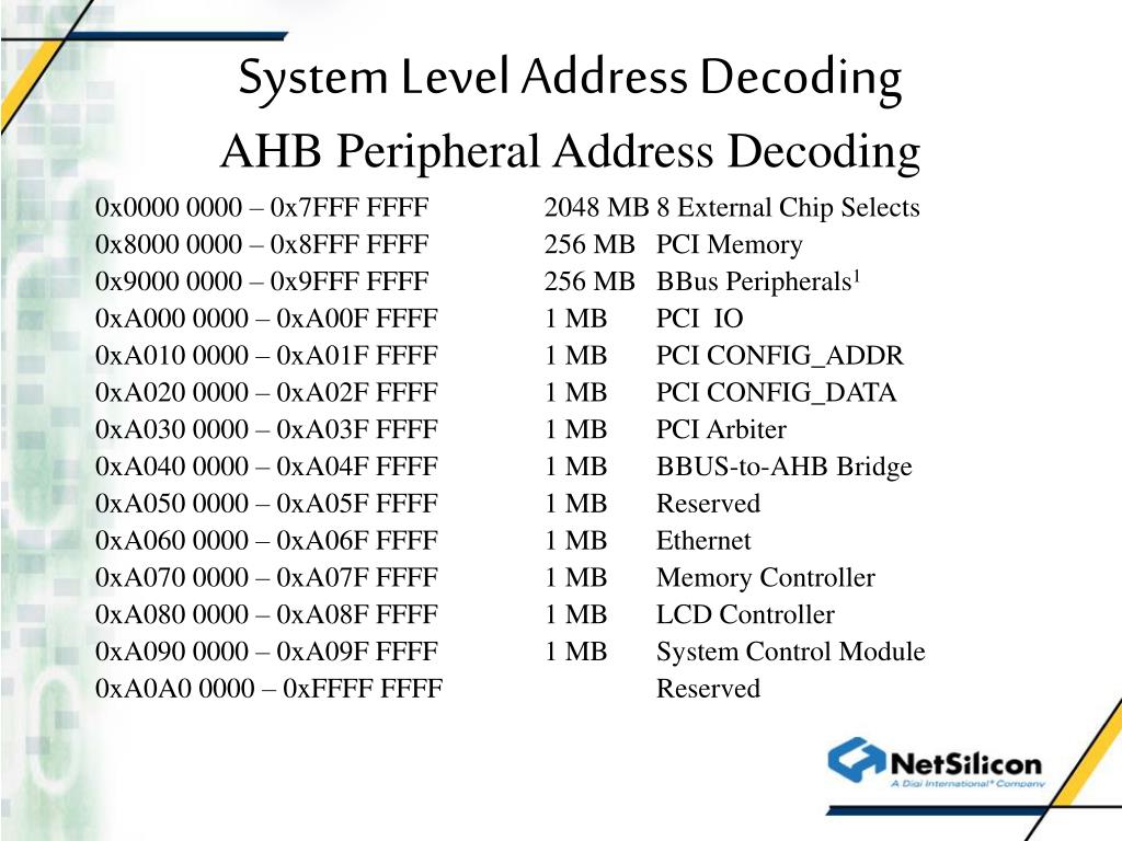 System Level Address DecodingAHB Peripheral Address Decoding 0x0000 0000 – 0x7FFF FFFF 2048 MB 8 External Chip Selects 0x8000 0000 – 0x8FFF FFFF 256 MB PCI Memory 0x9000 0000 – 0x9FFF FFFF 256 MB BBus Peripherals1 0xA000 0000 – 0xA00F FFFF 1 MB PCI IO 0xA010 0000 – 0xA01F FFFF 1 MB PCI CONFIG_ADDR 0xA020 0000 – 0xA02F FFFF 1 MB PCI CONFIG_DATA 0xA030 0000 – 0xA03F FFFF 1 MB PCI Arbiter 0xA040 0000 – 0xA04F FFFF 1 MB BBUS-to-AHB Bridge 0xA050 0000 – 0xA05F FFFF 1 MB Reserved 0xA060 0000 – 0xA06F FFFF 1 MB Ethernet 0xA070 0000 – 0xA07F FFFF 1 MB Memory Controller 0xA080 0000 – 0xA08F FFFF 1 MB LCD Controller 0xA090 0000 – 0xA09F FFFF 1 MB System Control Module 0xA0A0 0000 – 0xFFFF FFFF Reserved