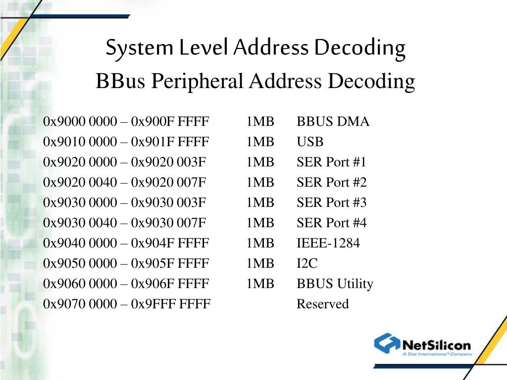 System Level Address DecodingBBus Peripheral Address Decoding 0x9000 0000 – 0x900F FFFF 1MB BBUS DMA 0x9010 0000 – 0x901F FFFF 1MB USB 0x9020 0000 – 0x9020 003F 1MB SER Port #1 0x9020 0040 – 0x9020 007F 1MB SER Port #2 0x9030 0000 – 0x9030 003F 1MB SER Port #3 0x9030 0040 – 0x9030 007F 1MB SER Port #4 0x9040 0000 – 0x904F FFFF 1MB IEEE-1284 0x9050 0000 – 0x905F FFFF 1MB I2C 0x9060 0000 – 0x906F FFFF 1MB BBUS Utility 0x9070 0000 – 0x9FFF FFFF Reserved