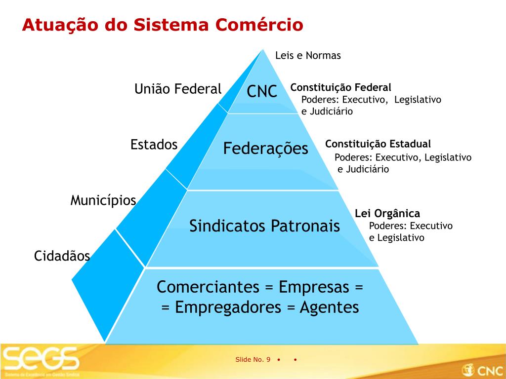 Leis e Normas União Federal CNC Constituição Federal Poderes: Executivo, Legislativo e Judiciário Estados Constituição Estadual Federações Poderes: Executivo, Legislativo e Judiciário Municípios Lei Orgânica Sindicatos Patronais Poderes: Executivo e Legislativo Cidadãos Comerciantes = Empresas = = Empregadores = Agentes Atuação do Sistema Comércio