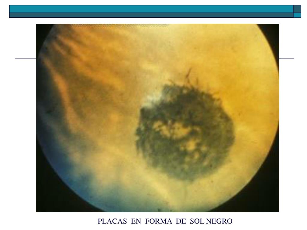 CARACTERISITICAS CLINICAS • Placas salmón hemorragias intrarretinianas por oclusión arteriolar • Lesión de sol negro áreas de hipertrofia e hiperplasia EPR • Puntos iridiscentes depósito hemosiderina por debajo de MLI post absorción de hemorragias