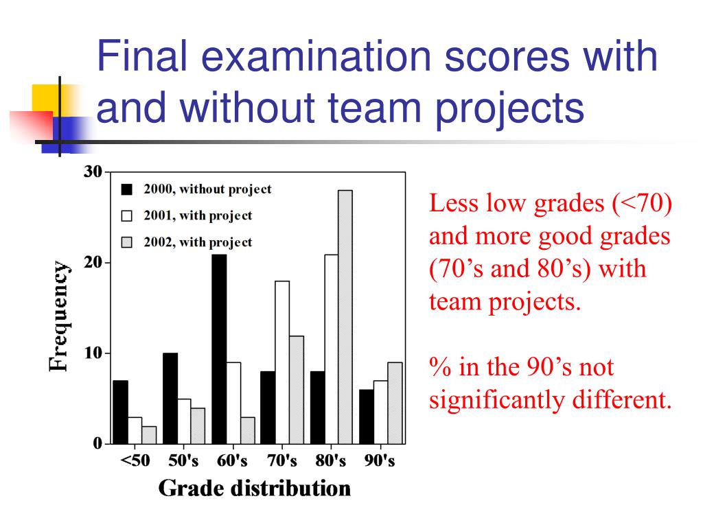 Final examination scores with and without team projects Less low grades (<70) and more good grades (70’s and 80’s) with team projects. % in the 90’s not significantly different.