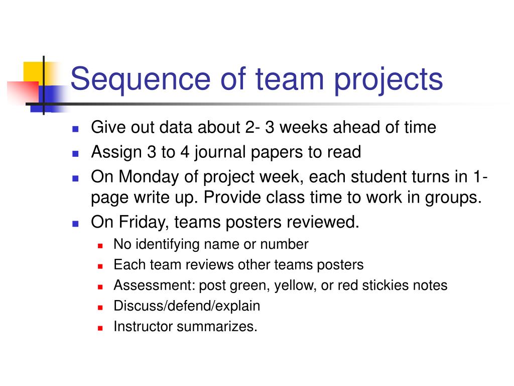 Sequence of team projects • Give out data about 2- 3 weeks ahead of time • Assign 3 to 4 journal papers to read • On Monday of project week, each student turns in 1-page write up. Provide class time to work in groups. • On Friday, teams posters reviewed. • No identifying name or number • Each team reviews other teams posters • Assessment: post green, yellow, or red stickies notes • Discuss/defend/explain • Instructor summarizes.
