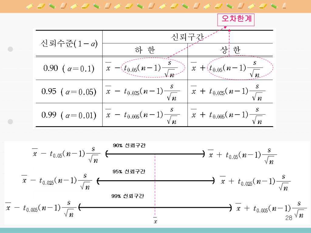 에 대한 90%오차한계 : 에 대한 95%오차한계 : 에 대한 99%오차한계 :
