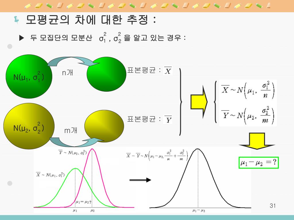 σ2 , σ2 1 2 ▶ 두 모집단의 모분산 을 알고 있는 경우 : 표본평균 : n개 표본평균 : m개 N(μ1, σ2 ) N(μ2, σ2 ) 1 2 • 모평균의 차에 대한 추정 :