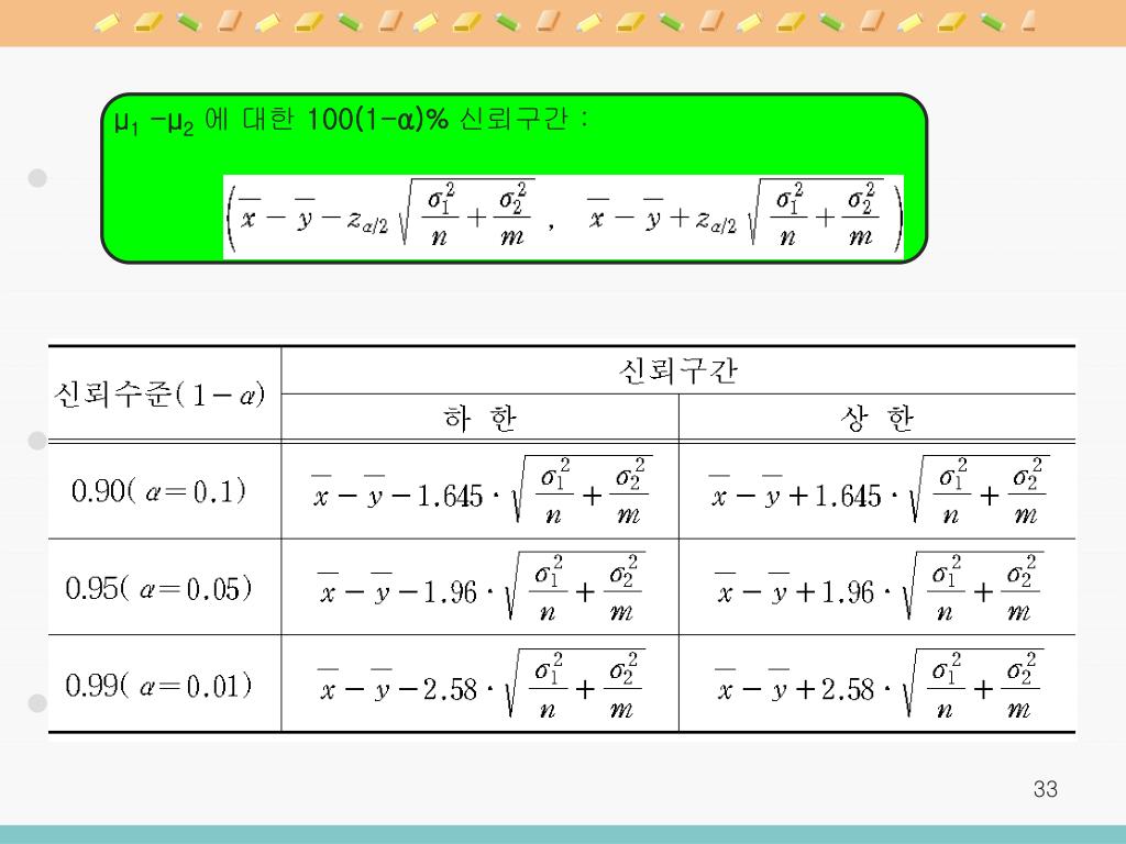 ▶ 에 대한 100(1-α)%의 오차한계 : 에 대한 90%의 오차한계 : 에 대한 95%의 오차한계 : 에 대한 99%의 오차한계 : 추정분포 표준오차 ▶두 모평균의 차 μ1 -μ2에 대한 점추정량 :