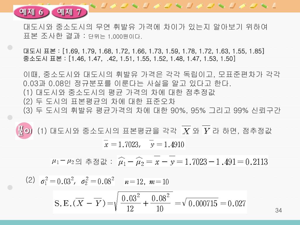 대도시와 중소도시의 무연 휘발유 가격에 차이가 있는지 알아보기 위하여 표본 조사한 결과 : 단위는 1,000원이다. 대도시 표본 : [1.69, 1.79, 1.68, 1.72, 1.66, 1.73, 1.59, 1.78, 1.72, 1.63, 1.55, 1.85] 중소도시 표본 : [1.46, 1.47, .42, 1.51, 1.55, 1.52, 1.48, 1.47, 1.53, 1.50] 이때, 중소도시와 대도시의 휘발유 가격은 각각 독립이고, 모표준편차가 각각 0.03과 0.08인 정규분포를 이룬다는 사실을 알고 있다고 한다. (1) 대도시와 중소도시의 평균 가격의 차에 대한 점추정값 (2) 두 도시의 표본평균의 차에 대한 표준오차 (3) 두 도시의 휘발유 평균가격의 차에 대한 90%, 95% 그리고 99% 신뢰구간 (1) 대도시와 중소도시의 표본평균을 각각 와 라 하면, 점추정값 의 추정값 : (2)
