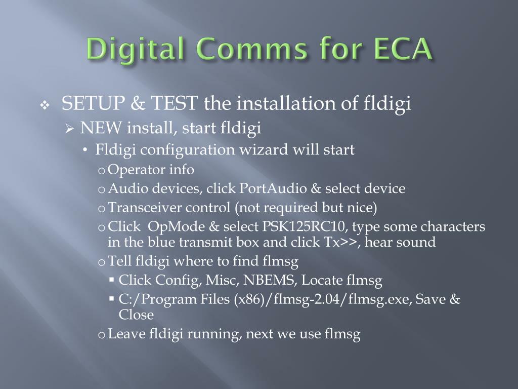 Digital Comms for ECA • SETUP & TEST the installation of fldigi • NEW install, start fldigi • Fldigi configuration wizard will start • Operator info • Audio devices, click PortAudio & select device • Transceiver control (not required but nice) • Click OpMode & select PSK125RC10, type some characters in the blue transmit box and click Tx>>, hear sound • Tell fldigi where to find flmsg • Click Config, Misc, NBEMS, Locate flmsg • C:/Program Files (x86)/flmsg-2.04/flmsg.exe, Save & Close • Leave fldigi running, next we use flmsg