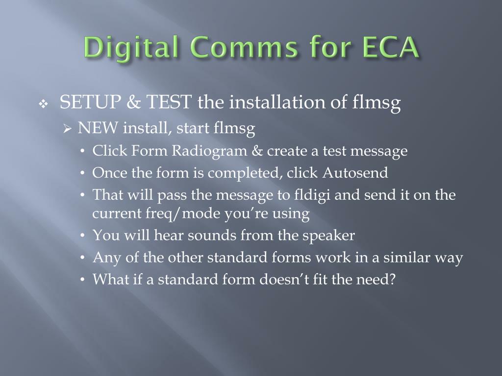 Digital Comms for ECA • WHY fldigi, flmsg, RMS Express (RMSE) & itshfbc? • WHERE to get them • HOW to install them • SETUP & TEST the installation • USE them in drills • USE them anytime • SUMMARY • Q&A