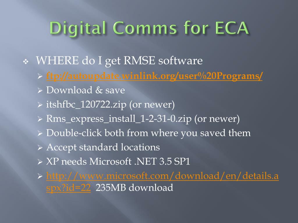 Digital Comms for ECA • WHERE do I get RMSE software • ftp://autoupdate.winlink.org/user%20Programs/ • Download & save • itshfbc_120722.zip (or newer) • Rms_express_install_1-2-31-0.zip (or newer) • Double-click both from where you saved them • Accept standard locations • XP needs Microsoft .NET 3.5 SP1 • http://www.microsoft.com/download/en/details.aspx?id=22 235MB download