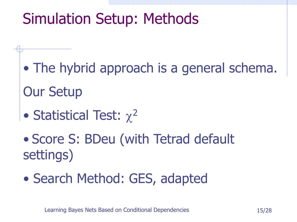 Simulation Setup: Methods • The hybrid approach is a general schema. • Our Setup • Statistical Test: 2 • Score S: BDeu (with Tetrad default settings) • Search Method: GES, adapted Learning Bayes Nets Based on Conditional Dependencies