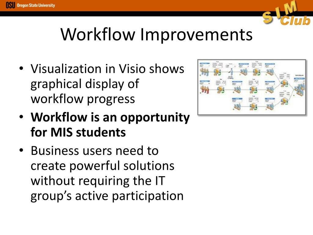 Workflow Improvements Visualization in Visio shows graphical display of workflow progress Workflow is an opportunity for MIS students Business users need to create powerful solutions without requiring the IT group’s active participation