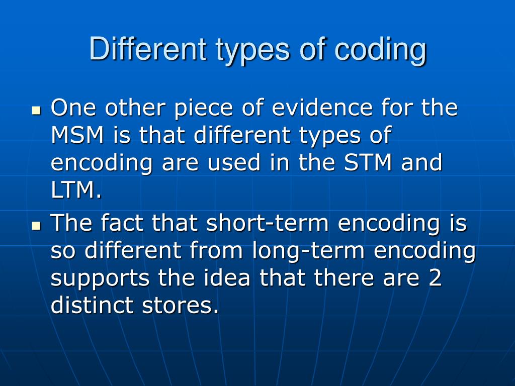 Different types of coding • One other piece of evidence for the MSM is that different types of encoding are used in the STM and LTM. • The fact that short-term encoding is so different from long-term encoding supports the idea that there are 2 distinct stores.