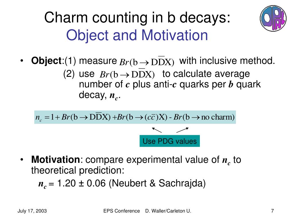 Outline • Object, motivation • Method • Results • Charm counting in beauty decays • Object, motivation • Method • Results • Conclusions Analysesof Z0 data! EPS Conference D. Waller/Carleton U.