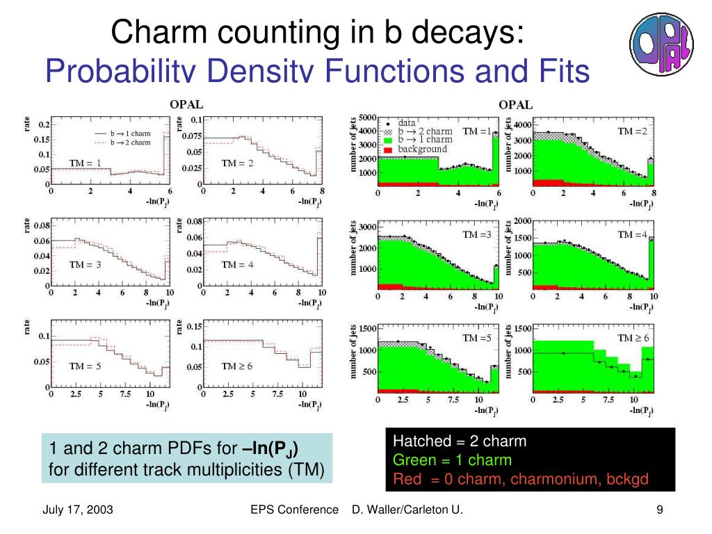 Hatched = 2 charm Green = 1 charm Red = 0 charm, charmonium, bckgd 1 and 2 charm PDFs for –ln(PJ) for different track multiplicities (TM) Charm counting in b decays:Probability Density Functions and Fits EPS Conference D. Waller/Carleton U.