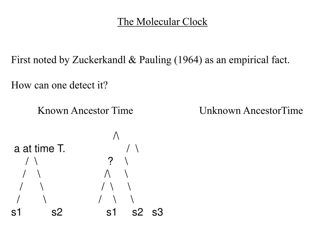 The Molecular Clock First noted by Zuckerkandl & Pauling (1964) as an empirical fact. How can one detect it? Known Ancestor Time Unknown AncestorTime /\ a at time T. / \ / \ ? \ / \ /\ \ / \ / \ \ / \ / \ \ s1 s2 s1 s2 s3