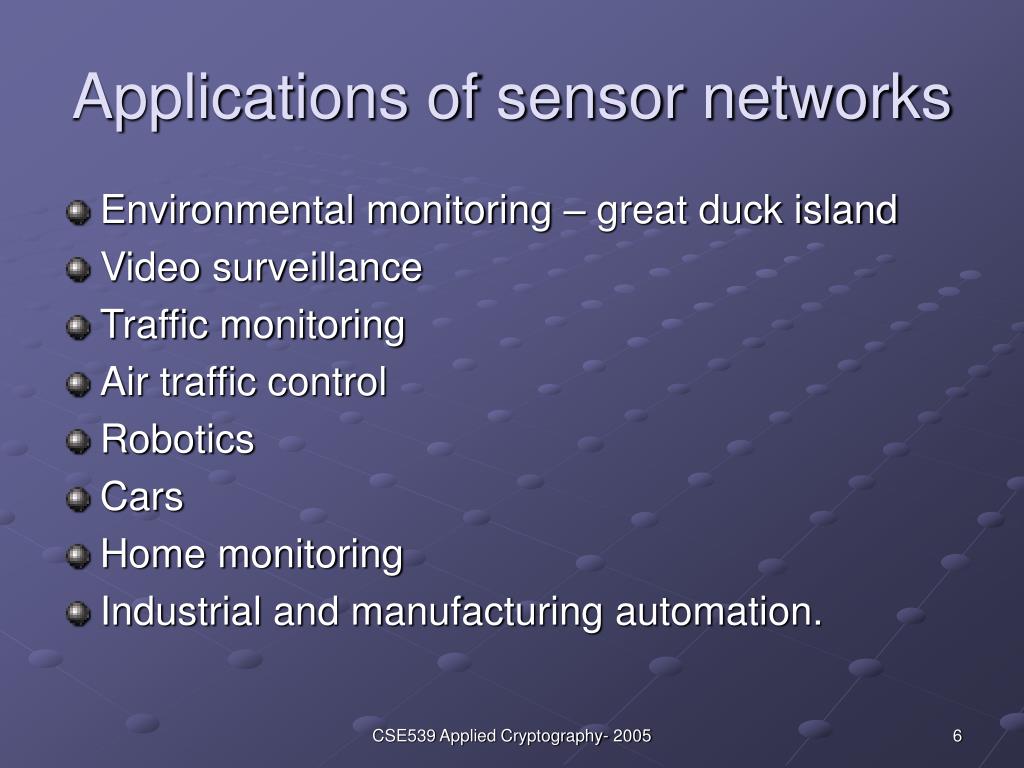 Applications of sensor networks • Environmental monitoring – great duck island • Video surveillance • Traffic monitoring • Air traffic control • Robotics • Cars • Home monitoring • Industrial and manufacturing automation. CSE539 Applied Cryptography- 2005