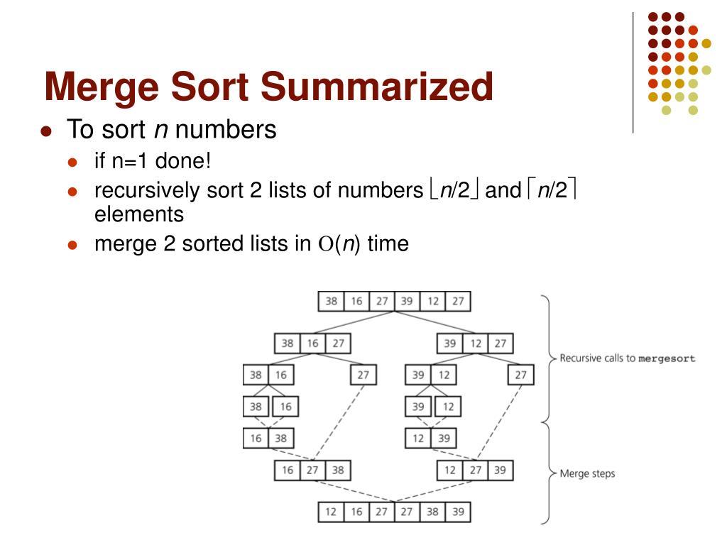 Merge Sort Summarized • To sort n numbers • if n=1 done! • recursively sort 2 lists of numbers ën/2û and én/2ù elements • merge 2 sorted lists in O(n) time